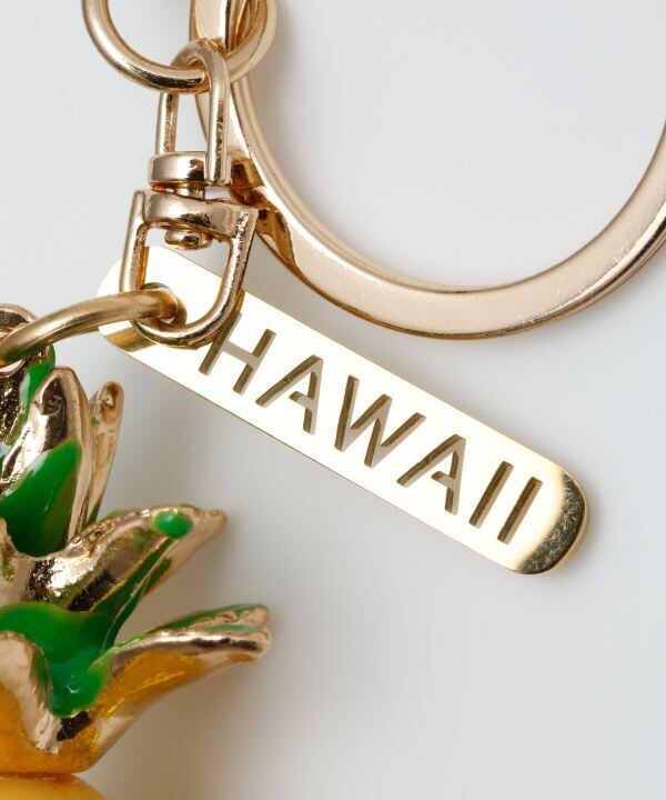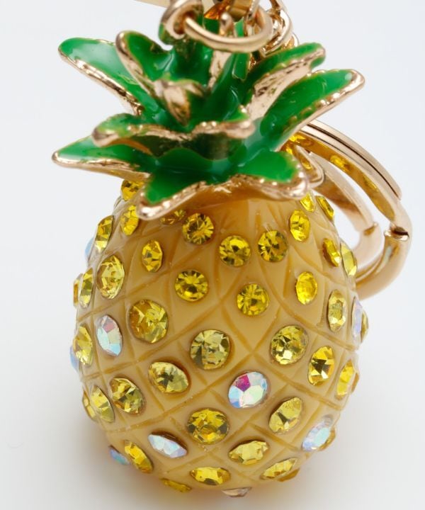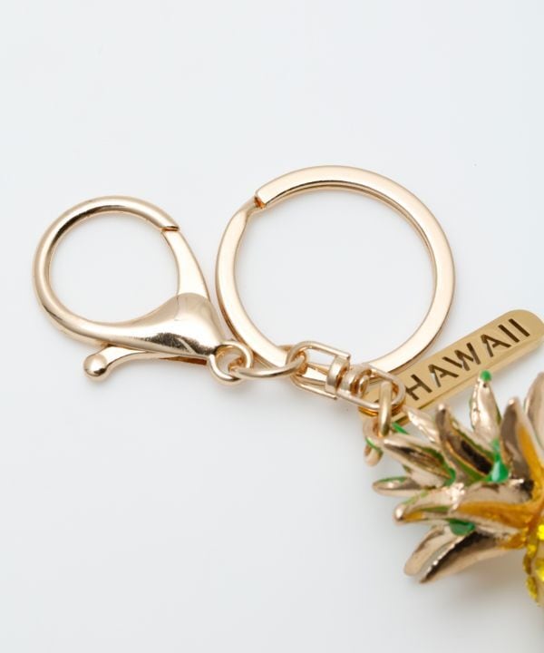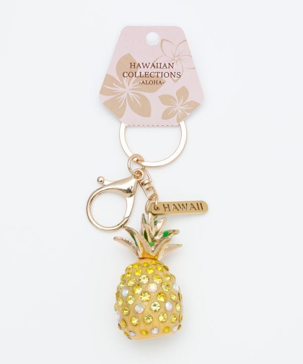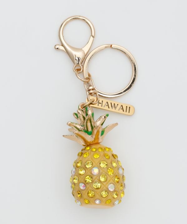 ハワイのお土産屋さんにありそうな、ビジューいっぱいの立体的なパイナップルキーホルダー。
