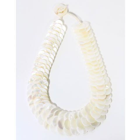 鮮やかなカラーが印象的。胸元に彩りをプラス。天然素材のシェルをひとつひとつ手作りで重ね合わせた技法は、サンセットにきらめくマーメイド模様のように光り輝き、胸元を豪華に飾ります。※天然貝素材本来の色ムラがあります。※濃色は多少の色落ち、色移りの可能性があります。