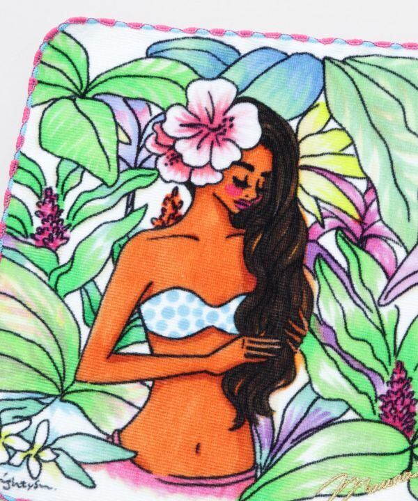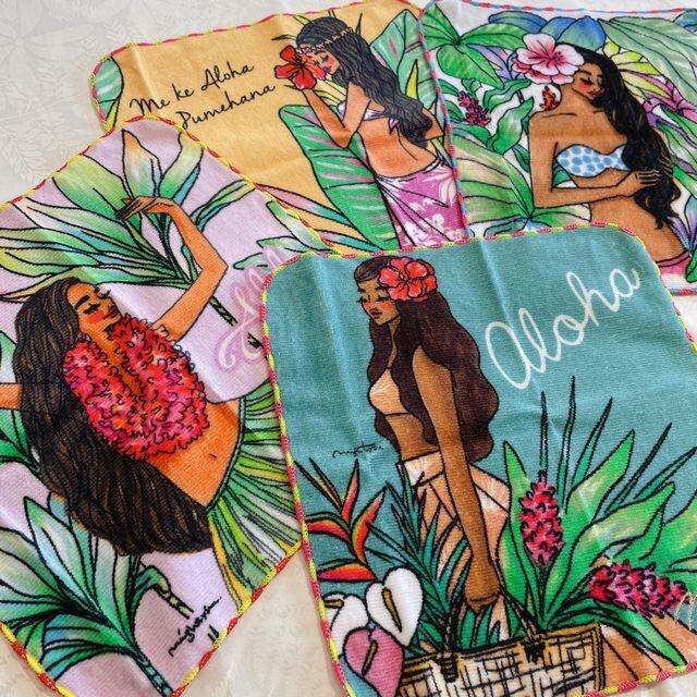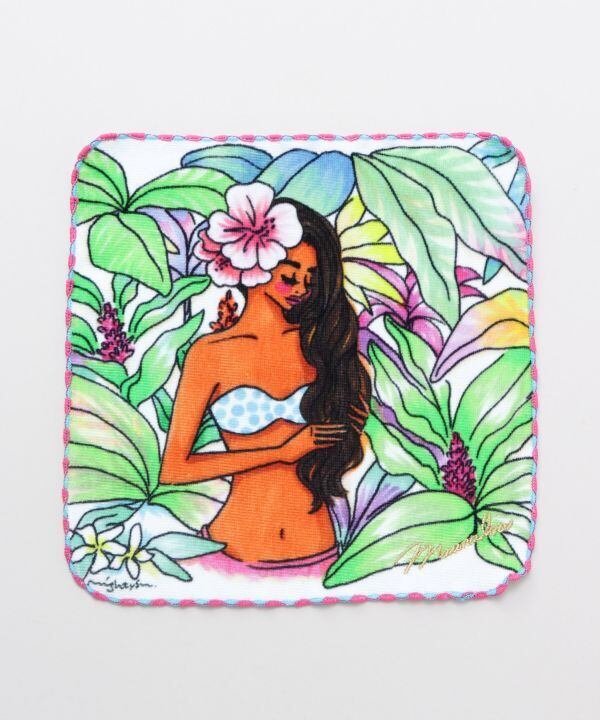 イラストレーター、マイティ・スーのイラストをプリントしたタオルハンカチ。