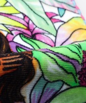 メロー刺繍でふちどられたカラフルで鮮やかなデザイン。